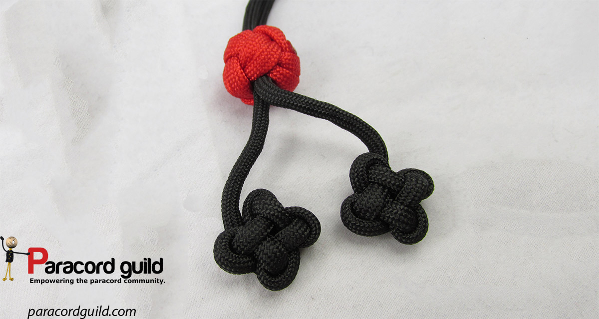 I then made two cloverleaf knots, one on each end of the paracord cords. As the final part of the fob, I made a paracord ranger bead over the two main cords. The technique I use for these double beads is simply to make a turks head knot onto my finger, slide it onto the fob and tighten it there.